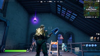 Head up the stairs, and you’ll see the canister floating, here.fortnite week 3 alien artifact location 3 gameplay