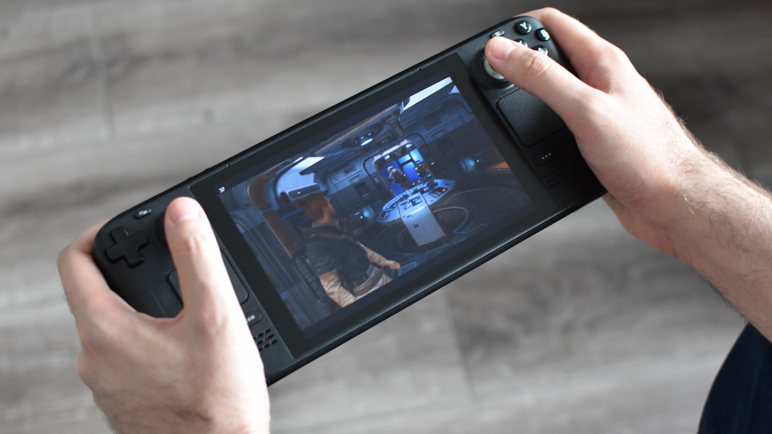 I’ve also noticed that the Deck’s native 1280×800 resolution isn’t being applied correctly after choosing it in the display settings. Although it’s not instantly noticeable while pushing our ginger Jedi lad around, on some menu screens and even on the ship’s galaxy map, text and prompts will run off the left and right edges of the screen. 1280×720 seems to work okay, but 800p just nudges these UI elements out of place.