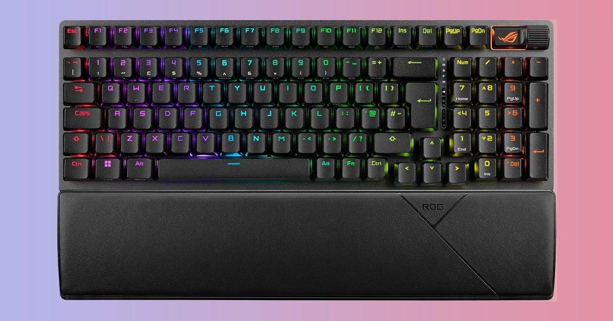 PBT keycaps are a pleasant inclusion, providing more of a premium touch and a more durable finish, as is the addition of a wristrest to complete the package. Wireless connectivity is handled with either Bluetooth or low-latency 2.4GHz, and Asus rates this keyboard to last for 80-90 hours on a charge with the RGB on. Turn this off, though, and Asus reckon it could last up to 1,500 hours. That’s… yeesh, 62 and a half days.